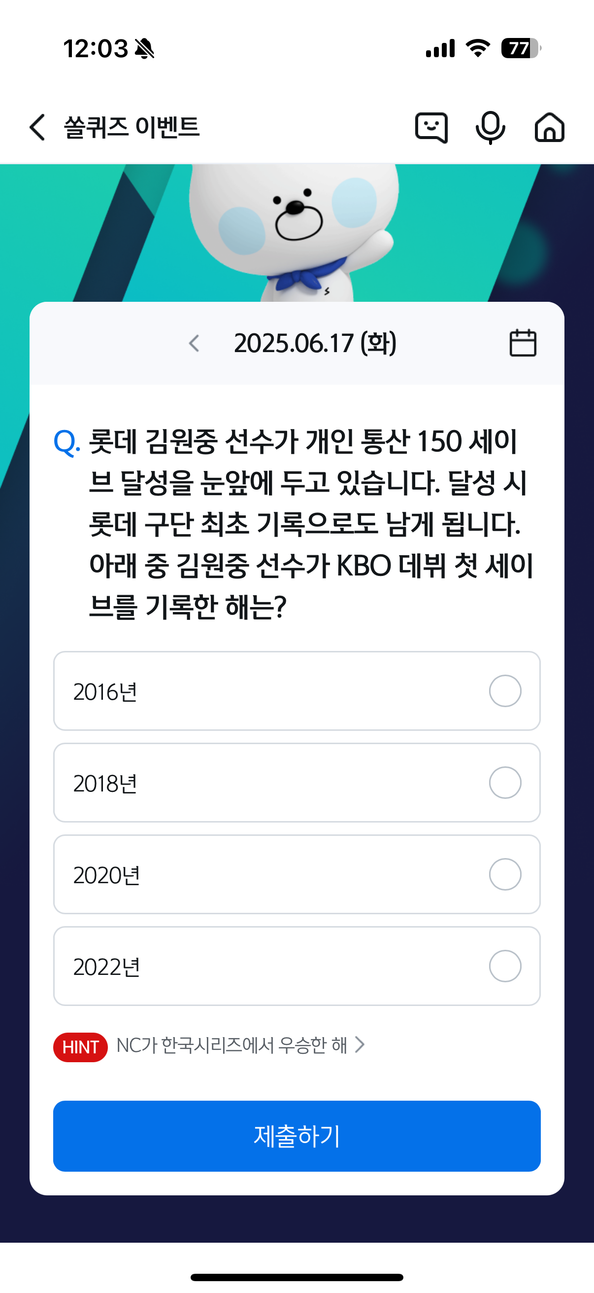 문제: 롯데 김원중 선수가 개인 통산 150 세이브 달성을 눈앞에 두고 있습니다. 달성 시 롯데 구단 최초 기록으로도 남게 됩니다. 아래 중 김원중 선수가 KBO 데뷔 첫 세이브를 기록한 해는? NC가 한국시리즈에서 우승한 해